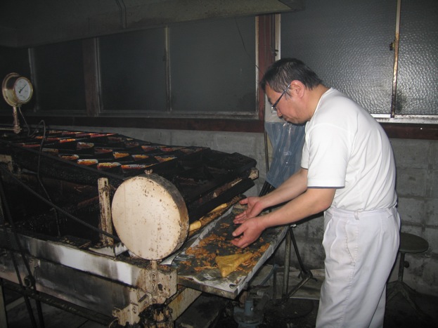遅くまで仕事をされていました。機械で油揚げを作っておられました。