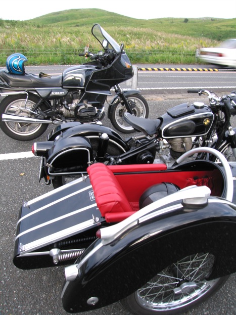 その中に混ざって、僕も軽快(?)に走っていると、カルスト台地の駐車場に、サイドカーがついた1台のBMW・・・