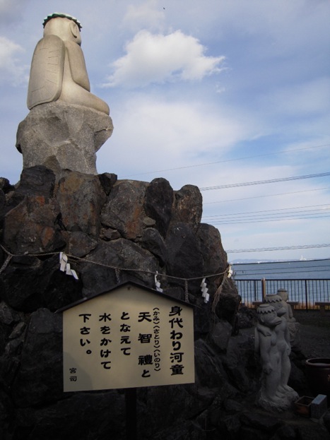 下から見ると河童の石像が立っている