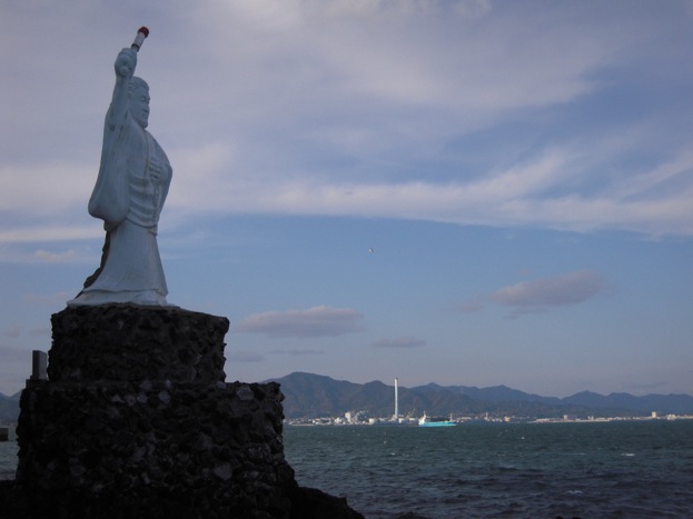 僧清虚は、1838年諸国巡礼の途中、青浜の岬周辺で難破する船が多いことを知り、浜にとどまることを決意。74才で亡くなるまでの13年間、船の目印とすべく火を焚き続けました。1973年、部埼燈台下の岩場に、門司の有志によって僧清像が建設されました。