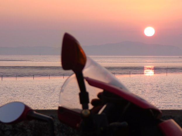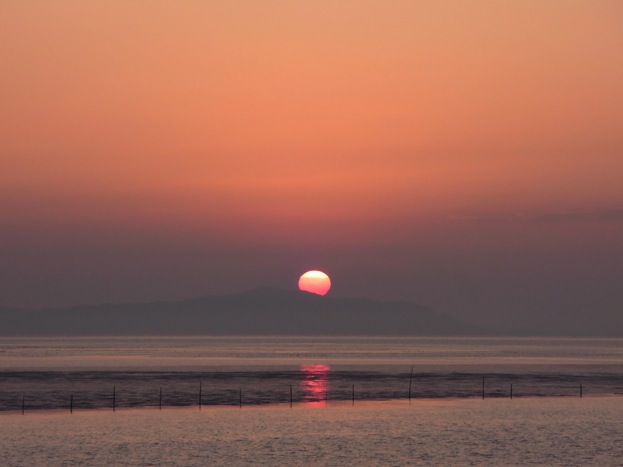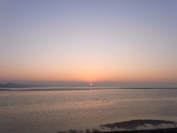 国道から「乃木浜公園」の方に入って公園前を「員光川」まで突き当たり、堤防沿いを角まで進んだ所でタイミング良く「小野田」方面から朝日が登ってきた。
