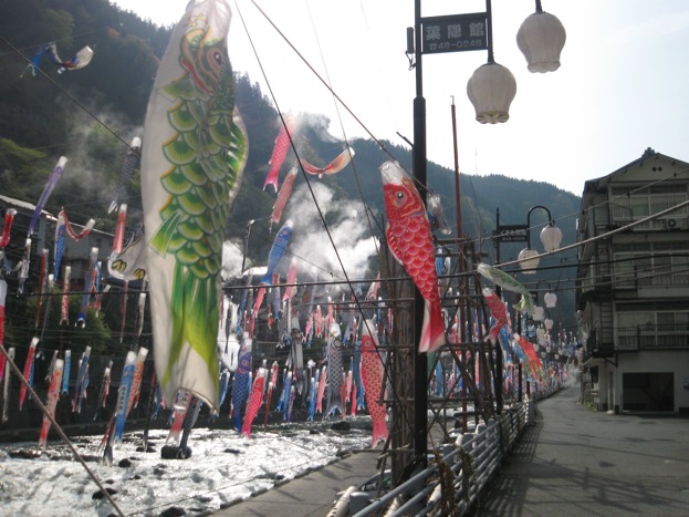 風が吹いていなかったので、泳いでる姿が見れなかったのは残念だったけど、古びた温泉街と、川の上を埋め尽くす鯉のぼりの大群がマッチしていて、とっても良い雰囲気でした。