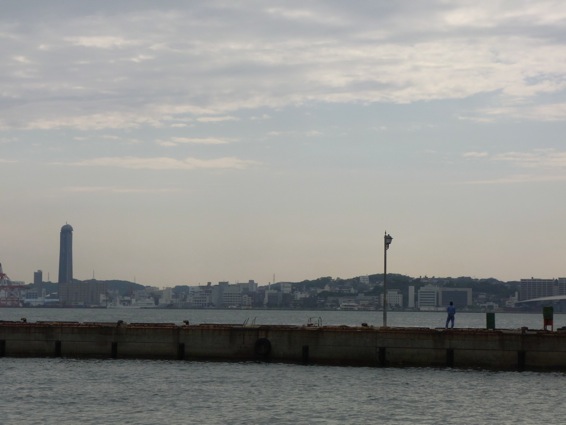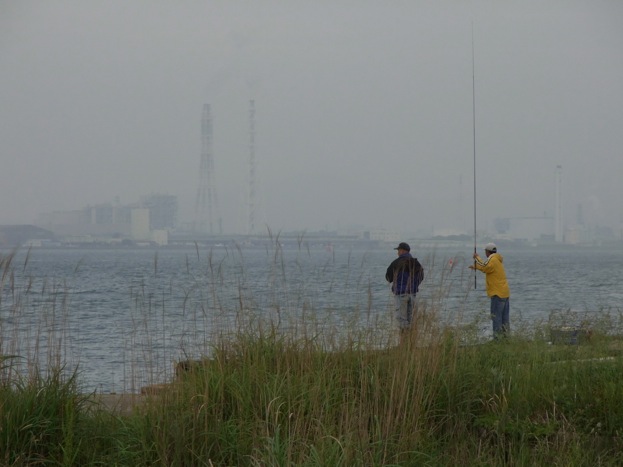 霊園から海に下ると、ここも朝から釣り人が . . .