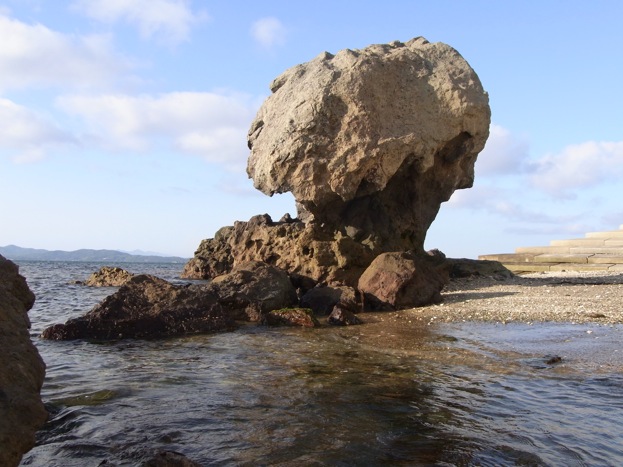 このとき、鬼の投げた大きな岩が鳩島で、干潮のとき歩いて渡れそうな海士ヶ瀬は、小さな岩をたくさん投げた所だと伝えられています。