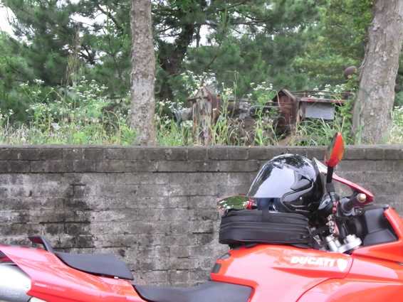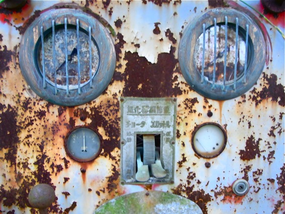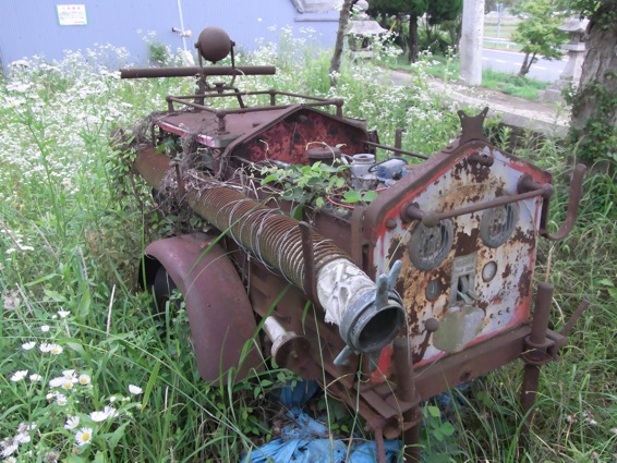 ブロック塀の草むらに、サビた鉄のかたまりが . . .