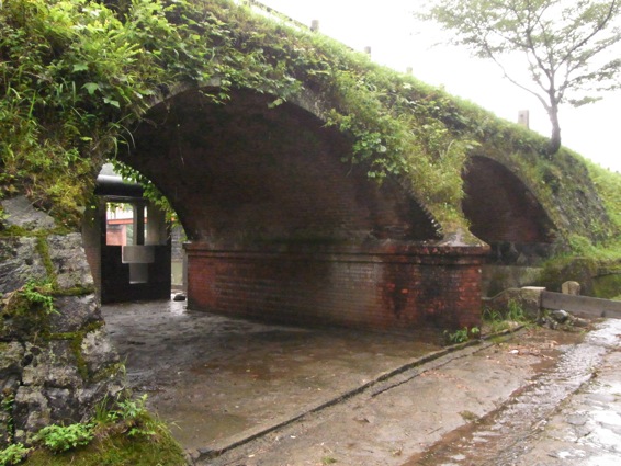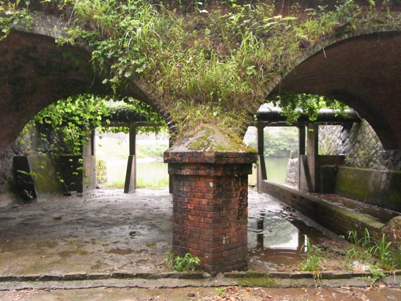 眼鏡橋下から取水塔を見ると、こ〜んな感じ